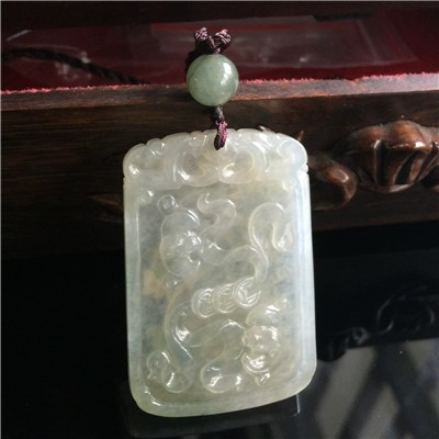 翡翠為冰種質(zhì)地細膩溫潤;淺浮雕正面為龍,背面為福在眼前,顏色為白色帶黃色調(diào),頗有古意。